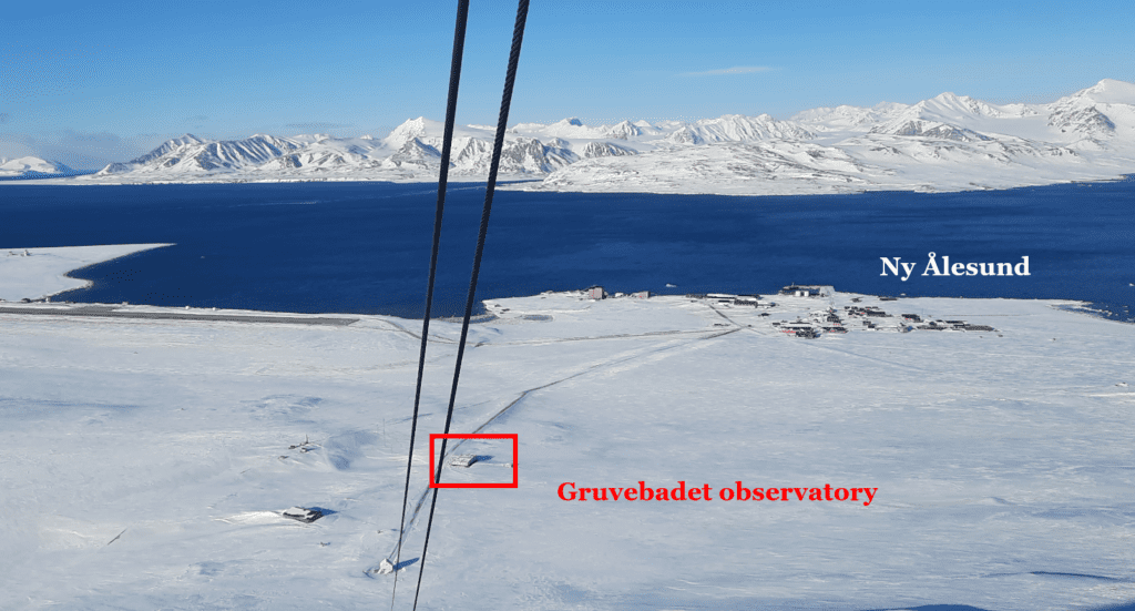 View of Gruvebadet Observatory at 30 m elevation as seen from the cable car. The non-conventional weapon of choice allowing measurements between the two observatories located at different altitudes between approximately 50 and 475 meters was the cable car, which transports scientists and cargo to the Zeppelin observatory