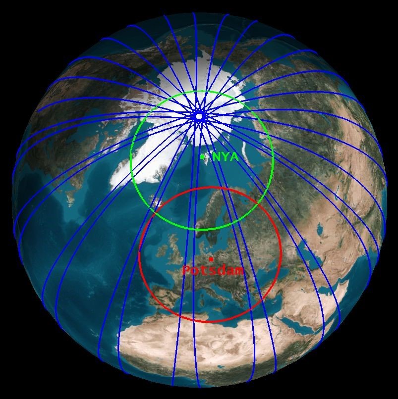 CHAMP was the first satellite that continuously conducted atmospheric sounding with so called GNSS radio occultation measurements (among other). The products of such measurements are comparable to meteorological data from radiosondes, e.g., as launched with balloons in Ny-Ålesund by AWIPEV. The more than 200 globally distributed measurements per day from CHAMP thus had a high potential to improve weather forecasts and climate research. GFZ wanted to foster the new method with scientific studies and an own data processing chain at Potsdam, but also with the continuous provision of CHAMP data to other parties, not later than 3 hours after on-board measurements, as this was the deadline for data assimilation by weather services. Only about 4 contacts per day are possible between satellites in a CHAMP-like orbit and ground stations in Germany (see graphic 1), resulting in a mean data latency of 6 hours (24 hours/4). About 15 contacts per day are possibly with an antenna in Ny-Ålesund, so that the raw data provision latency is only about 96 minutes (24 hours/15). This was fully sufficient to meet the 3 hours criteria of the interested weather services. In consequence they used CHAMP data in their weather forecast processes, first test wise over several years, later as part of their standard routines.