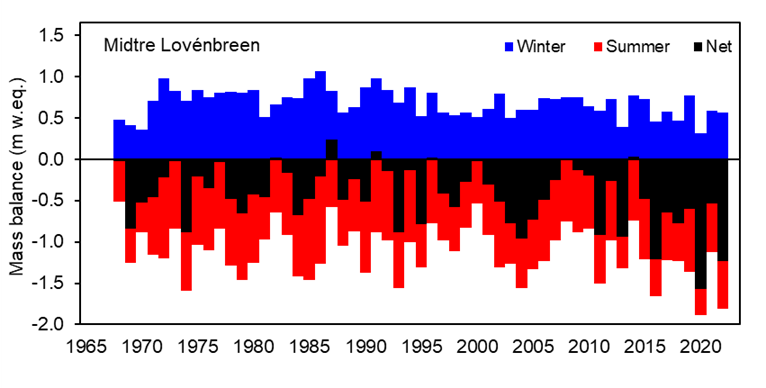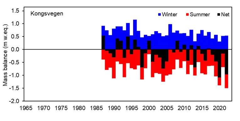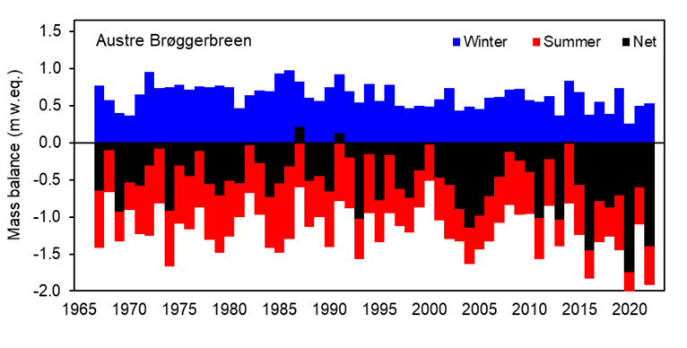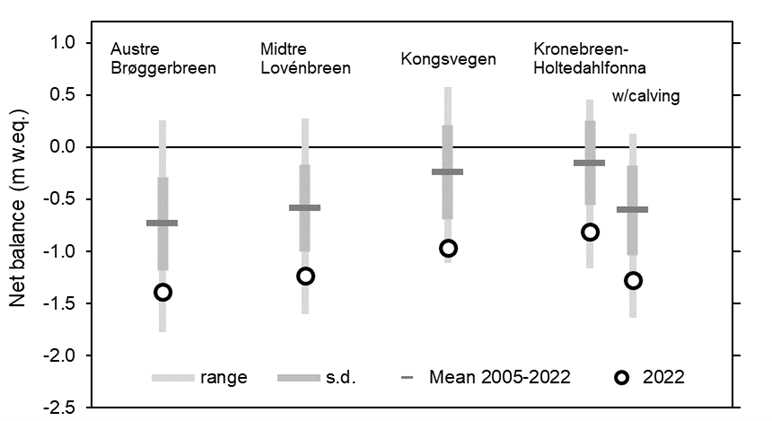 Net mass balance for 2021/22 (Figure B) was strongly negative for all the glaciers, more negative than the average for the period 2005-2022, but not as negative as the record year 2019/20, despite the record warm summer temperature recorded at Ny-Ålesund.