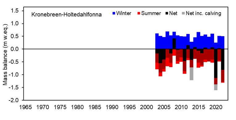 The smaller low-lying glaciers Austre Brøggerbreen and Midtre Lovénbreen almost always have negative net balances, since their accumulation areas are not at a high enough altitude to retain winter snow through the summer melt season. Net balances are more positive on Kongsvegen and Kronebreen-Holtedahlfonna since their accumulation areas are both higher and larger than the smaller glaciers. When calving is included, however, Kronebreen-Holtedahlfonna’s net balance is roughly as negative as the smaller glaciers.