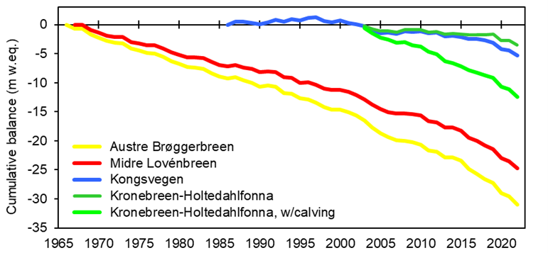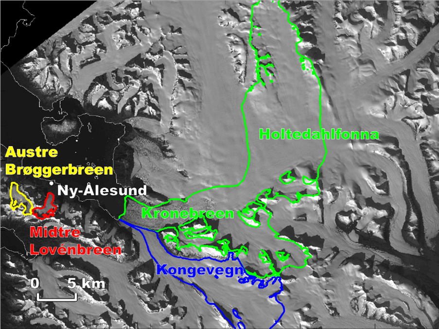 The Norwegian Polar Institute (NPI) is monitoring mass balance of four area glaciers around Ny-Ålesund: Austre Brøggerbreen (since 1967); Midtre Lovénbreen, (since 1968); Kongsvegen (since 1987); and the glacier system Kronebreen/Holtedahlfonna (since 2003) (Figure A).