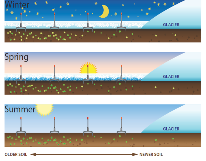 We expect microbiological activity to happen even under the snowpack, but how early in the year and what is the impact of soil age are questions that are yet to be answered. Ultimately, physical, and biological results are to be linked through conceptual and numerical modeling. This would enable us to derive the sensitivity of these soils to environmental change and hopefully predict the development of these growing terrestrial landscapes.