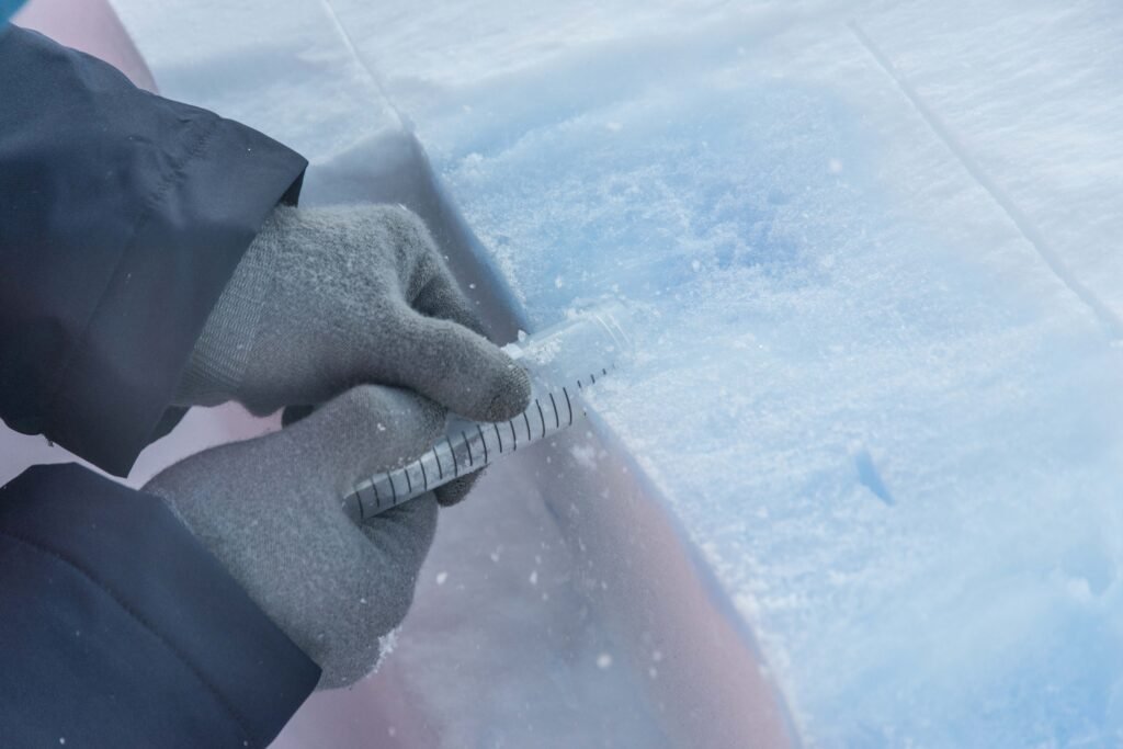 The first step of each experiment was to establish baseline conditions of the snowpack in terms of temperature, layer structure and chemistry. Subsequently, to simulate a rain-on-snow event, the team used a blue-coloured water tracer of known temperature, volume, and isotopic signature (d2H) and applied it over a defined snow pit area. Temperature changes of near-surface snow associated with melting were monitored with several thermometers until snow temperatures started to drop again and refreezing became evident. Afterwards, the structural melt imprint was described, and samples were taken in selected places for stable water isotope analysis.