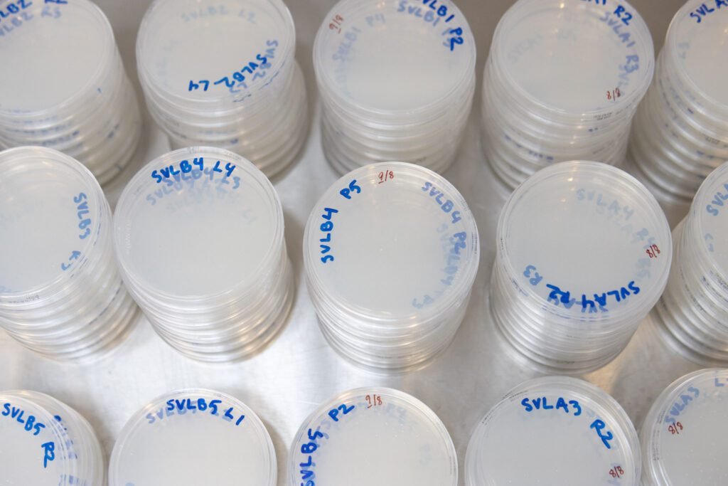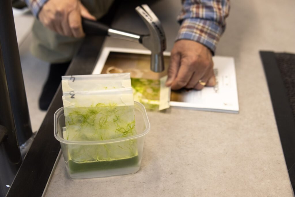 To answer those questions, Kari and Marjo collected grasses from different populations around Ny-Ålesund. Those locations were based on previous descriptions by plant ecologists and were present in high abundance – it wasn’t hard to find them. After sampling, the grasses were taken to the terrestrial lab Veksthuset to be treated further. Leaves and roots were washed carefully by Marjo. Subsequently, the leaves got washed in an ultrasonic water bath to get off the bacteria on the surface. But how can you access the microbes inside the plant? The answer was “hammering”. It turns out that a hammer is great for opening the plant without damaging the single plant cells. So that is exactly what Kari did, as he hammered the plant leaves into a juicy substance.