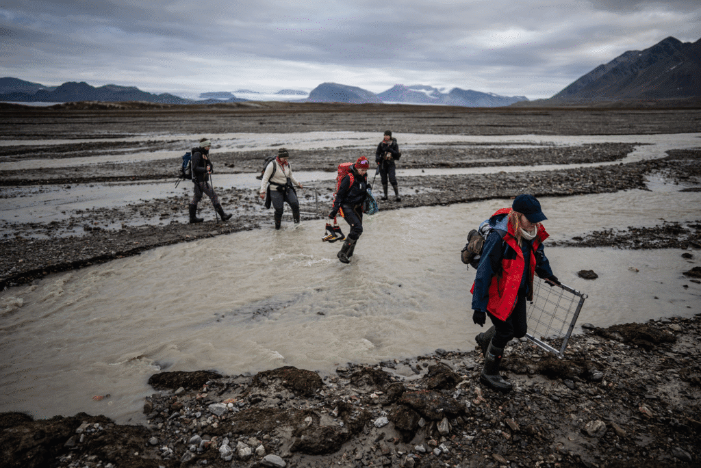Crossing a meltwater river on the way to the glacier. Picture by Frederik Brogaard.