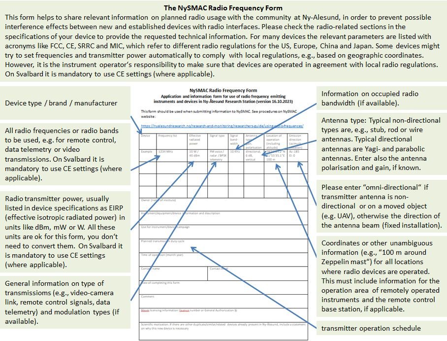 All RF usage in Ny-Ålesund needs to be brought to NySMAC, additional to and independently from the application of licenses (if required), which must be directed to Nkom.
