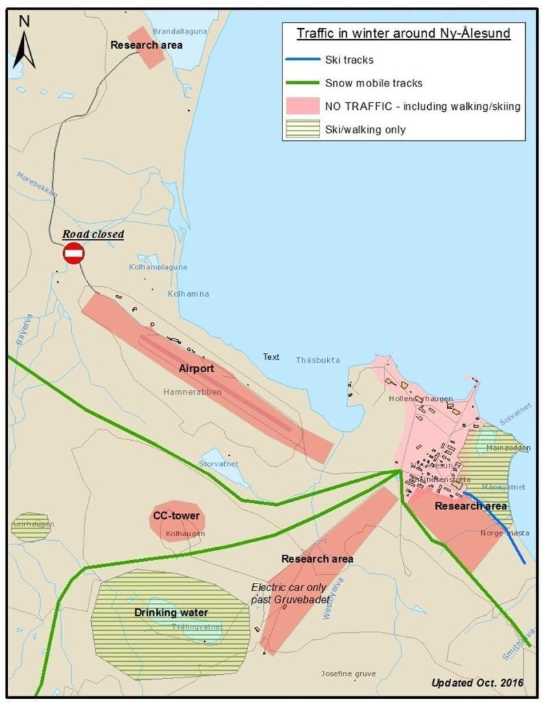 Areas east of the Old Post Office, east of Italy building and the AWIPEV observatory, and east of Gruvebadet are dedicated for snow sampling throughout the winter season, and should not be entered. The use of snowblower is also restricted to avoid contamination of these areas.
