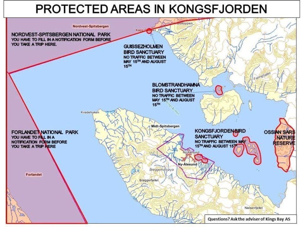 There are three bird sanctuaries in Kongsfjorden. The sanctuaries include the islands and the surrounding sea, 300 meters from the shore. No traffic is allowed in the sanctuaries between the 15th of May and the 15th of August. The banned activity includes boating, kayaking and disembarking. Any scientifically warranted visit in the sanctuaries during this time period requires specific permission from the Governor of Svalbard.